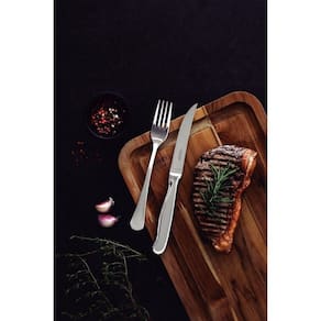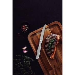 Para quem gosta de um bom churrasco também aprecia uma bela faca. O design é sofisticado e leva muita elegância para a mesa. Totalmente feita de aço inox, altamente durável, mantém suas características , preservando a beleza, a higiene e a durabilidade do material. Faca com lâmina temperada e fio serrilhado, que garante maior durabilidade no fio de corte e maior resistência à corrosão, e por sua característica de temperabilidade, não risca as porcelanas. Acabamento em alto brilho. O cabo da faca se adapta melhor a palma da mão. Possui equilíbrio harmônico entre o cabo e a lâmina. Pode ser lavada diariamente na máquina de lavar louças.