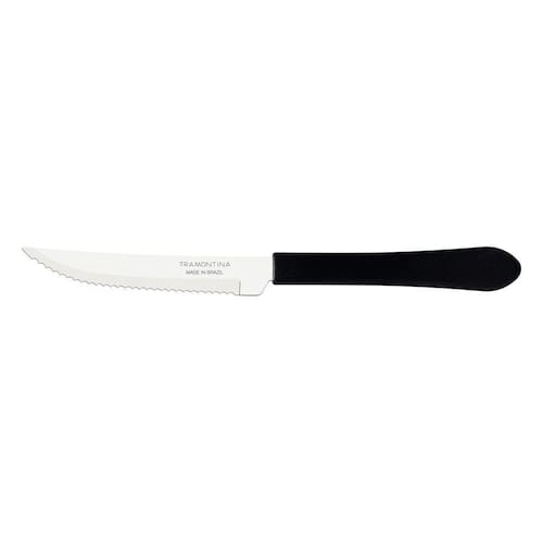 Já pensou em usar talheres de qualidade na hora de receber seus convidados para um churrasco? A Faca para Churrasco Tramontina Leme com Lâmina em Aço Inox e Cabo de Polipropileno Preto 4 polegadas é perfeita para essa ocasião. A peça é produzida com lâmina em aço inox e possui o cabo em polipropileno proporcionando maior durabilidade e resistência. Qualidade é com a Tramontina! Orientações A lâmina de aço inox tem maior durabilidade do fio devido ao tratamento térmico. O cabo de polipropileno possui maior resistência e durabilidade. Pode ir à máquina de lavar louças facilitando seu dia a dia. Observações Antes da primeira utilização, lave bem a peça e seque-a.Produto cortante e perfurante: tenha cuidado ao manusear e mantenha fora do alcance das crianças.Para maior durabilidade do produto recomenda-se secar bem antes de guardar, mesmo após lavagem em máquina. Para descarte do produto e embalagem siga as orientações de reciclagem vigentes. Características Gerais EAN13 7891112173064 DUN14 17891112173061 NCM 8211.91.00 Peso Líquido 0,0167 kg. Peso Bruto 0,0167 kg. Metragem 0,000032 m³. Dimensões Embalagem (Compr. X Larg. X Alt.) 200x 18x 9 mm. Cor 1 000000 Hexa
