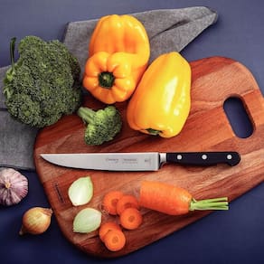 Informações técnicas: A lâmina possui tratamento térmico diferenciado, composto por têmpera, sub-zero e revenimento, conta ainda com dureza da lâmina de 55 e 58 HRC, que garante maior resistência do fio e precisão no corte; O cabo de policarbonato reforçado com fibra de vidro garante alta durabilidade, equilíbrio e segurança; A lâmina forjada de aço inox especial garante um fio com maior durabilidade e precisão; O cabo ergonômico proporciona maior segurança, equilíbrio e conforto na hora do corte; Com lâmina rígida e estreita, facilita o corte de diversos alimentos; Pode ir à máquina de lavar louças facilitando seu dia a dia.