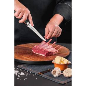 Desossar vai ficar muito mais prático com a Faca para Desossar Tramontina Century com Lâmina em Aço Inox e Cabo em Policarbonato 6 Polegadas. Desenvolvida especialmente para facilitar a separação da carne e ossos, ela apresenta Lâmina em aço inox e Cabo de policarbonato com fibra de vidro, que alia segurança, qualidade e durabilidade para o seu manuseio. As facas da linha Century são desenvolvidas especialmente para uso intenso e podem ser lavadas à máquina de lavar, permitindo mais facilidade para a sua rotina dentro da cozinha. Ideal para separar a carne dos ossos e tirar a gordura. A lâmina forjada de aço inox especial garante um fio com maior durabilidade e precisão. A lâmina possui tratamento térmico diferenciado, composto por têmpera, sub-zero e revenimento. E conta com dureza da lâmina de 55 e 58 HRC, que garante maior resistência do fio e precisão no corte. O cabo de policarbonato reforçado com fibra de vidro garante alta durabilidade, equilíbrio e segurança. O cabo ergonômico proporciona maior segurança, equilíbrio e conforto na hora do corte. Pode ir à máquina de lavar louças facilitando seu dia a dia. Antes da primeira utilização, lave bem a peça e seque-a. Produto cortante e perfurante: tenha cuidado ao manusear e mantenha fora do alcance das crianças. Para maior durabilidade do produto recomenda-se secar bem antes de guardar, mesmo após lavagem em máquina. Recomenda-se o uso de tábuas de polipropileno ou madeira da Tramontina para maior durabilidade do fio da faca. Não é indicado o uso da faca para o corte de alimentos congelados. Mantenha sempre sua faca afiada utilizando os afiadores da Tramontina. Para descarte dos produtos e embalagens siga as orientações de reciclagem vigentes.