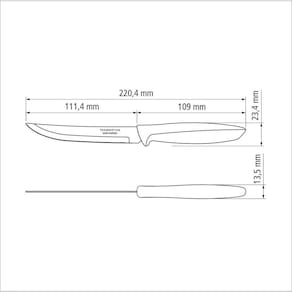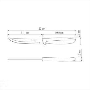 Embele suas receitas com a Faca para Frutas Tramontina Plenus com Lâmina em Aço Inox com Fio Liso e Cabo de Polipropileno Preto 5 Polegadas. Desenvolvida para descascar e cortar frutas, ela é confortável e prática durante o uso diário. Produzida com cabo em polipropileno na cor preta, possui lâmina de fio liso de 5 polegadas em aço inox. Uma faca essencial que traz leveza na hora de preparar e servir. Orientações Ideal para cortar e descascar frutas diversas.A lâmina de aço inox têm maior durabilidade do fio devido ao tratamento térmico. O cabo de polipropileno possui maior resistência e durabilidade. Pode ir à máquina de lavar louças facilitando seu dia a dia. Características Gerais EAN13 7891112235076 DUN14 17891112235073 NCM 8211.92.10 Peso Líquido 0,0275 kg. Peso Bruto 0,0380 kg. Metragem 0,000242 m³. Dimensões Embalagem (Compr. X Larg. X Alt.) 15x 56x 288 mm. Dimensões Produto (Compr. X Larg. X Alt.) 220x 23x 13 mm. Cor 1 0000000 Hexa Observações Antes da primeira utilização, lave bem a peça e seque-a. Produto cortante e perfurante: tenha cuidado ao manusear e mantenha fora do alcance das crianças. Para maior durabilidade do produto recomenda-se secar bem antes de guardar, mesmo após lavagem em máquina. Recomenda-se o uso de tábuas de polipropileno ou madeira da Tramontina para maior durabilidade do fio da faca. Não é indicado o uso da faca para o corte de alimentos congelados. Mantenha sempre sua faca afiada utilizando os afiadores da Tramontina.Para descarte dos produtos e embalagens siga as orientações de reciclagem vigentes.