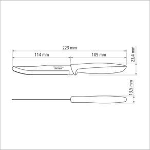 Suas frutas vão ficar mais gostosas com a Faca para Frutas Tramontina Plenus com Lâmina em Aço Inox e Cabo de Polipropileno 5 Polegadas da Linha Plenus. Ideal para descascar e cortar frutas, a faca possui fio liso e lâmina de 5 polegadas em aço inox. O cabo em polipropileno na cor preta é resistente e confortável no uso. É uma faca que se adequa a diferentes momentos do seu dia. Fácil de limpar, pode ser levada à máquina de lavar louças. Orientações Ideal para cortar e descascar frutas diversas.A lâmina de aço inox têm maior durabilidade do fio devido ao tratamento térmico. O cabo de polipropileno possui maior resistência e durabilidade. Pode ir à máquina de lavar louças facilitando seu dia a dia. Observações Antes da primeira utilização, lave bem a peça e seque-a. Produto cortante e perfurante: tenha cuidado ao manusear e mantenha fora do alcance das crianças. Para maior durabilidade do produto recomenda-se secar bem antes de guardar, mesmo após lavagem em máquina. Recomenda-se o uso de tábuas de polipropileno ou madeira da Tramontina para maior durabilidade do fio da faca. Não é indicado o uso da faca para o corte de alimentos congelados. Mantenha sempre sua faca afiada utilizando os afiadores da Tramontina.Para descarte dos produtos e embalagens siga as orientações de reciclagem vigentes. Características Gerais EAN13 7891112236868 DUN14 17891112236865 NCM 8211.92.10 Peso Líquido 0,0300 kg. Peso Bruto 0,0410 kg. Metragem 0,000222 m³. Dimensões Embalagem (Compr. X Larg. X Alt.) 14x 55x 288 mm. Dimensões Produto (Compr. X Larg. X Alt.) 223x 23x 14 mm. Cor 1 000000 Hexa