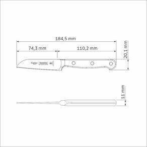 Antes da primeira utilização, lave bem a peça e seque-a. Produto cortante e perfurante: tenha cuidado ao manusear e mantenha fora do alcance das crianças. Para maior durabilidade do produto recomenda-se secar bem antes de guardar, mesmo após lavagem em máquina. Recomenda-se o uso de tábuas de polipropileno ou madeira da Tramontina para maior durabilidade do fio da faca. Não é indicado o uso da faca para o corte de alimentos congelados. Mantenha sempre sua faca afiada utilizando os afiadores da Tramontina.Para descarte dos produtos e embalagens siga as orientações de reciclagem vigentes.