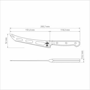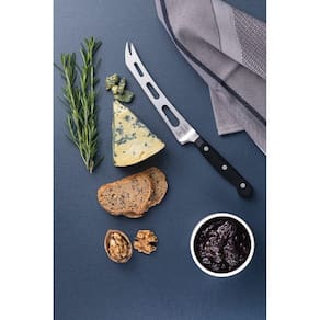 A Faca para Queijo Tramontina Century com Lâmina de Aço Inox e Cabo de Policarbonato com Fibra de Vidro Preto 6 polegadas será sua melhor ajudante na hora de trabalhar com queijos moles e semi-duros. Ela é produzida com lâmina forjada em aço inox e possui um fio de corte com maior durabilidade e precisão. O cabo é desenvolvido em policarbonato reforçado com fibra de vidro e garante alta durabilidade, equilíbrio e maior segurança durante a utilização. A escolha perfeita para quem preza por utensílios de alta performance! Orientações Ideal para cortar e fatiar queijos moles e semiduros.A lâmina forjada de aço inox especial garante um fio com maior durabilidade e precisão. A lâmina possui tratamento térmico diferenciado, composto por têmpera, sub-zero e revenimento. E conta com dureza da lâmina de 55 e 58 HRC, que garante maior resistência do fio e precisão no corte. O cabo de policarbonato reforçado com fibra de vidro garante alta durabilidade, equilíbrio e segurança. O cabo ergonômico proporciona maior segurança, equilíbrio e conforto na hora do corte. Pode ir à máquina de lavar louças facilitando seu dia a dia. Observações Antes da primeira utilização, lave bem a peça e seque-a. Produto cortante e perfurante: tenha cuidado ao manusear e mantenha fora do alcance das crianças. Para maior durabilidade do produto recomenda-se secar bem antes de guardar, mesmo após lavagem em máquina. Recomenda-se o uso de tábuas de polipropileno ou madeira da Tramontina para maior durabilidade do fio da faca. Não é indicado o uso da faca para o corte de alimentos congelados. Mantenha sempre sua faca afiada utilizando os afiadores da Tramontina.Para descarte dos produtos e embalagens siga as orientações de reciclagem vigentes. Características Gerais EAN13 7891112284401 DUN14 17891112284408 NCM 8211.92.10 Peso Líquido 0,0950 kg. Peso Bruto 0,1700 kg. Metragem 0,000924 m³. Dimensões Embalagem (Compr. X Larg. X Alt.) 93x 28x 355 mm. Dimensões Produto (Compr. X Larg. X Alt.) 266x 52x 13 mm. Cor 1 000000 Hexa