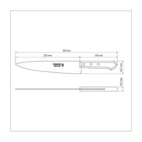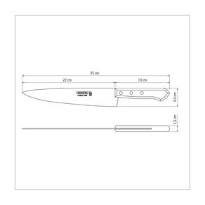 Tradicionalmente chamada de peixeira, se difundiu na cozinha para usos diversos. Lâmina de aço carbono com maior durabilidade e resistência do fio de corte. Cabo de madeira. Rebites de alumínio.