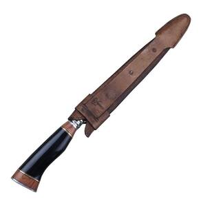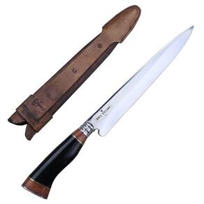 Faca Artesanal Para Churrasco Rodeio Aço Germany 9 Polegadas Com Cabo Em Chifre E Madeira Feito por mãos brasileiras A cutelaria elmo, tradicional por produzir peças de cutelaria fina artesanalmente, apresenta a marca criolla (facas forjadas) e rodeio (facas laminadas). Com anos de tradição, estudo e experiência, produz peças únicas com acabamento perfeito, empunhadura confortável e lâmina afiadíssima, pronta para lhe atender em todos os momentos - seja na churrasqueira ou na cozinha. A qualidade dos aços utilizados na confecção das facas confere um altíssimo perfil de corte e excelente manutenção de fio, sendo que o aço inox das facas laminadas é desenvolvido especialmente para a cutelaria elmo. Linha rodeio A linha rodeio da cutelaria elmo é uma excelente linha de facas de entrada para que quer se aventurar no mundo da cutelaria. Os modelos da linha foram projetados para o uso na cozinha, em churrascos e também como uma ótima opção para aquele ou presente especial. Estas facas possuem um ótimo custo-benefício. A alta durabilidade e o estilo e design da faca, além de seu conforto e excelente fio vão te surpreender Aço germany O tradicional e legítimo aço alemão, que garante um fio duradouro e preciso. Poucas cutelarias dominam este aço, que é extremamente forte e duro, e possui uma alta quantidade de carbono em sua composição. Conservação e cuidados Sempre limpar e secar a peça após o uso. Não utilizar abrasivos para a limpeza ou materiais corrosivos. Não utilizar a peça para corte sobre materiais com dureza superior a do aço. Utilize preferencialmente em tábuas de madeira. Corte sempre os alimentos sobre uma superfície macia, nunca sobre plástico duro, porcelana esmaltada, vidro, louça ou metal. Poupe sua faca evitando usá-la para abrir latas ou realizar atividades que não são propostas para uma faca. Afiação À medida que uma faca vai sendo utilizada, o seu gume perde o fio e, consequentemente, exige maior esforço para cortar. O que acontece é que os dentes minúsculos que constituem o gume (invisíveis a olho nu) encontram-se dobrados e é necessário restaurá-los e realinhá-los para voltar a obter o máximo poder de corte. Há dois métodos para manter a boa performance de uma faca, afia-la na pedra ou na chaira. Confira aqui as opções da linha afiação na bull village. Usando um afiador com chaira ou uma chaira antes e depois de cada utilização manterá o gume em perfeitas condições. Atenção: produto artesanal. Pode conter variações de cores e pequenos detalhes. Faca artesanal para churrasco rodeio aço carbono germany 9 polegadas com cabo em chifre e madeira Referência: 350269 Comprimento da lâmina (cl) 9 polegadas - aprox. 23 cm Comprimento do cabo (cc) 13,5 cm Largura (l) 35 mm Espessura da lâmina 3 mm Material da lâmina (ml) Aço germany Material do cabo (mc) Chifre e madeira Material da bainha (mb) bovino Peso do produto (com bainha) 260 g Produto artesanal, sujeito a pequenas alterações de cor e detalhes. Atenção cabos feitos de maneira artesanal que podem conter variações de cor