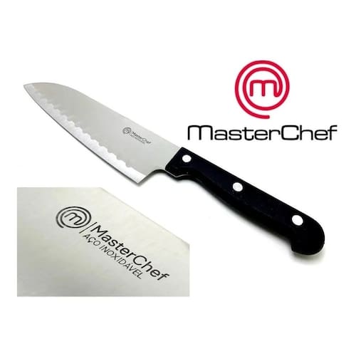 A Faca Santoku 7 Official Knife Quotidien Forjada MasterChef é uma faca para uso geral, de origem japonesa. Forjada em uma única peça em aço inox, esta faca esbanja qualidade e beleza. Santoku significa três virtudes ou três usos, referindo-se às três tarefas que essa faca desempenha muito bem: cortar, picar e fatiar. Siga as instruções de conservação e manutenção da embalagem. Composição: Aço inox e materiais sintéticos Medidas: Comprimento: 29 cm Comprimento da lâmina: 16 cm Largura da lâmina: 4,5 cm Peso: 135 gramas