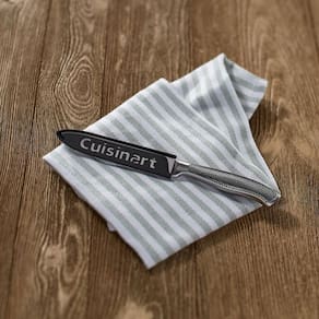 Marca: Cuisinart Modelo: C77SS-5SUT Cor: Prata Tipo: Faca utilitaria serrilhada Dimensoes: 6.99 X 2.24 X 35.56 cm Comprimento da lamina: 13 cm Material da lamina: Aco inox de alto carbono Tipo de fio: Serrilhado Material do cabo: Aco inox texturizado Indicacao de uso: Tomates, frutas, legumes, paes pequenos e alimentos com casca firme Acessorios: Capa protetora para lamina Garantia: 3 meses