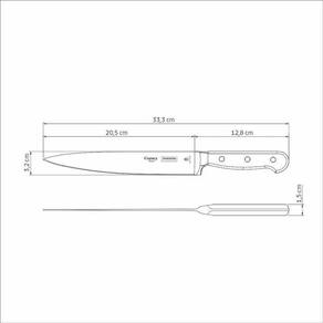 Modo de Uso: Antes da primeira utilização, lave bem a peça e seque-a. Produto cortante e perfurante: tenha cuidado ao manusear e mantenha fora do alcance das crianças. Para maior durabilidade do produto recomenda-se secar bem antes de guardar, mesmo após lavagem em máquina. Recomenda-se o uso de tábuas de polipropileno ou madeira da Tramontina para maior durabilidade do fio da faca. Não é indicado o uso da faca para o corte de alimentos congelados. Mantenha sempre sua faca afiada utilizando os afiadores da Tramontina. Para descarte dos produtos e embalagens siga as orientações de reciclagem vigentes.