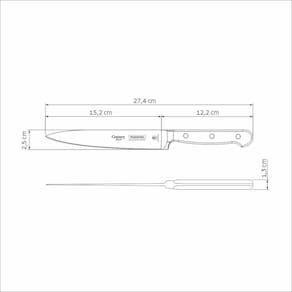 Antes da primeira utilização, lave bem a peça e seque-a. Produto cortante e perfurante: tenha cuidado ao manusear e mantenha fora do alcance das crianças. Para maior durabilidade do produto recomenda-se secar bem antes de guardar, mesmo após lavagem em máquina. Recomenda-se o uso de tábuas de polipropileno ou madeira da Tramontina para maior durabilidade do fio da faca. Não é indicado o uso da faca para o corte de alimentos congelados. Mantenha sempre sua faca afiada utilizando os afiadores da Tramontina.Para descarte dos produtos e embalagens siga as orientações de reciclagem vigentes.
