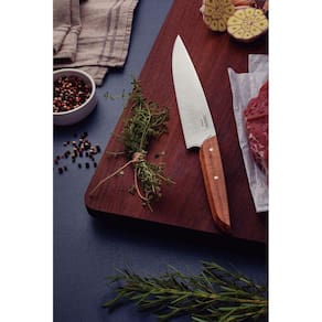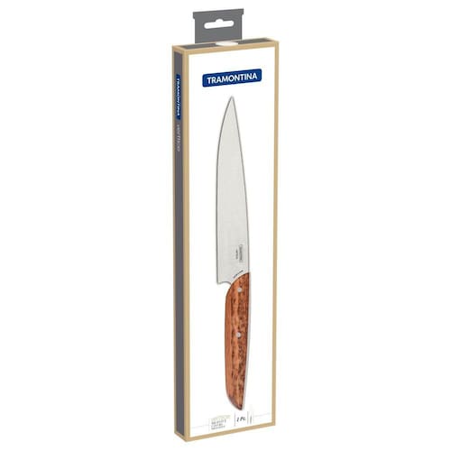 Faca Utility Tramontina Verttice com Lâmina em Aço Inox e Cabo de Madeira Natural 8" Se você deseja uma faca versátil e funcional para completar seu jogo de facas na cozinha, conte com a Faca Utility Tramontina Verttice com Lâmina em Aço Inox e Cabo de Madeira Natural 8 polegadas. Produzida com uma lâmina em aço inox, ela é altamente resistente e durável. Seu cabo é em madeira natural com rebites de aço inox e oferece durabilidade e um manuseio super confortável. Uma faca indispensável para facilitar seu dia a dia durante os preparos! Instruções de Primeiro Uso Antes da primeira utilização, lave bem a peça e seque-a.Produto cortante e perfurante: tenha cuidado ao manusear e mantenha fora do alcance das crianças.Para maior durabilidade do produto recomenda-se lavar manualmente e secá-lo antes de guardar.Recomenda-se o uso de tábuas de polipropileno ou madeira da Tramontina para maior durabilidade do fio da faca. Não é indicado o uso da faca para o corte de alimentos congelados. Mantenha sempre sua faca afiada utilizando os afiadores da Tramontina. Para descarte do produto e embalagem siga as orientações de reciclagem vigentes. Com ponta em formato de espada, auxilia na abertura e na perfuração dos alimentos.A lâmina de aço inox possui maior durabilidade do fio devido ao tratamento térmico.Cabo de madeira natural com rebites de aço inox. Garantia 90 dias para vícios ou defeitos de fabricação.