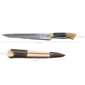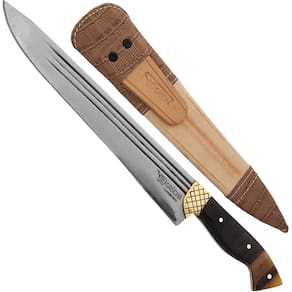 Material: - Couro; - Chifre; - Aço Carbono 1070: A lâmina é temperada a óleo em um processo bem artesanal. Possui grande resistência e mantém o fio por muito tempo. Por ser aço carbono, é um material que enferruja com facilidade, porém, a oxidação não interfere no fio. Para melhor conservação visual é necessário seguir os cuidados indicados a cima.