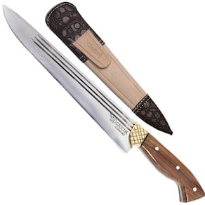 Com a faca de dez polegadas você tem uma peça ideal para cortes no dia a dia ou um churrasco de uma comemoração especial. Tenha praticidade com a lâmina em aço carbono, que se estende em todo o formato da faca, full tang, mantendo o fio por mais tempo, possuindo ainda um design na lâmina, 3 listras, trazendo detalhes únicos para a sua peça. Com o cabo de madeira, manuseio do seu produto torna-se muito mais fácil. Com a faca, acompanha a bainha de couro marrom com detalhes na cor salmão, lhe trazendo praticidade e segurança no armazenamento do seu produto. Com a faca de aço carbono seu corte será ainda mais especial.