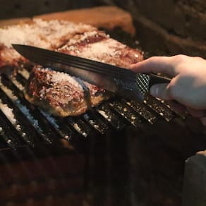 - Com a utilização, a lâmina cria uma pátina natural azulada ou acinzentada apreciada no universo da cutelaria. Trata-se de uma fina oxidação na superfície da lâmina com desenho determinado pelo manuseio da faca, isto confere personalidade à peça. Essa oxidação cria uma película extremamente dura que ajuda a proteger o aço
