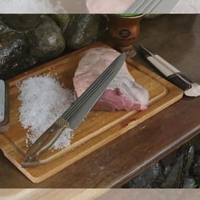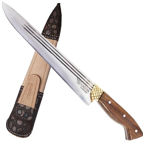 Material: - Couro; - Madeira; - Aço carbono 1070: Aço de maior resistência e dureza que mantem um excelente fio por mais tempo. Com a utilização, a lâmina cria uma pátina natural azulada ou acinzentada apreciada no universo da cutelaria. Trata-se de uma fina oxidação na superfície da lâmina com desenho determinado pelo manuseio da faca, isto confere personalidade à peça. Essa oxidação cria uma película extremamente dura que ajuda a proteger o aço.