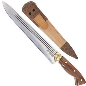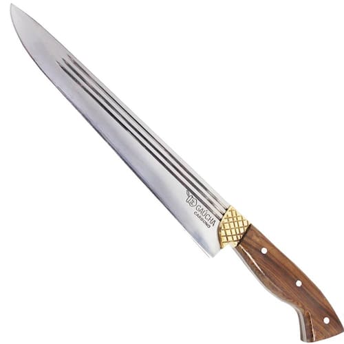 Com a faca de dez polegadas você tem uma peça ideal para cortes no dia a dia ou um churrasco de uma comemoração especial. Tenha praticidade com a lâmina em aço carbono, que se estende em todo o formato da faca, full tang, mantendo o fio por mais tempo, possuindo ainda um design na lâmina, 3 listras, trazendo detalhes únicos para a sua peça. Com o cabo de madeira, manuseio do seu produto torna-se muito mais fácil. Com a faca, acompanha a bainha de couro marrom com detalhes na cor salmão, lhe trazendo praticidade e segurança no armazenamento do seu produto. Com a faca de aço carbono seu corte será ainda mais especial.