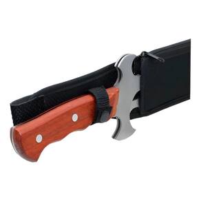 Possui lâmina de 35 cm em Aço 440 e cabo em madeira, oferecendo resistência,