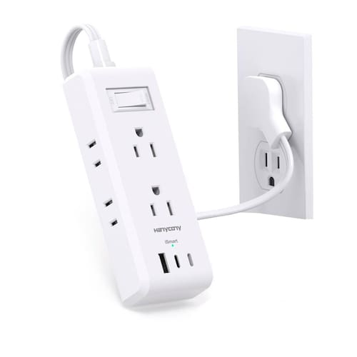 Cabo de extensão curto de 1 pé, régua de alimentação ultrafina de plugue plano, 6 saídas e 3 portas USB (2 USB C), extensor de várias tomadas com montagem na parede, sem protetor contra sobretensão para dormitório, cruzeiro e itens essenciais de viagem
