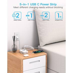 ?Régua de alimentação de viagem 5 em 1 com portas USB C?: Este cabo de extensão curto transforma uma tomada de parede em 2 tomadas Amplamente AC (15A/125V/1875 W), 2 portas USB C e 1 porta USB A, pode alimentar até 5 dispositivos de viagem essenciais simultaneamente em sua mesa ou mesa de cabeceira a partir de um pequeno filtro elétrico. O espaço extra entre cada tomada CA no filtro elétrico compacto oferece espaço para plugues maiores; as tomadas são distribuídas em lados diferentes sem bloqueio.