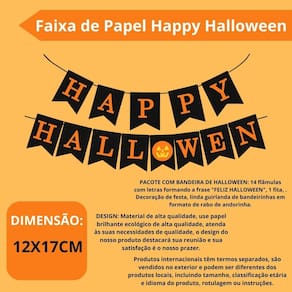 Faixa de Papel Happy Halloween - Decoração Festiva A Faixa de Papel Happy Halloween é o enfeite ideal para deixar sua festa ainda mais temática e divertida. Com design criativo e cores vibrantes, ela transforma o ambiente em um verdadeiro cenário de Halloween, sendo perfeita para decorar paredes, portas, mesas e ambientes em geral. Características do produto: Faixa decorativa com a frase Happy Halloween Produzida em papel resistente e leve Fácil de instalar em diferentes locais Design temático com detalhes que remetem ao Halloween Ideal para ambientes internos e externos cobertos Indicado para: Decoração de Halloween em casas, escolas, festas, eventos temáticos e vitrines. Conteúdo da embalagem: 1 faixa de papel Happy Halloween Marca: Não Informado