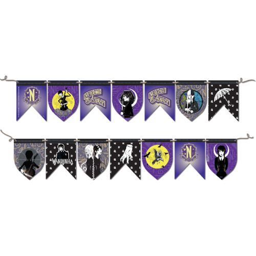 Faixa Decorativa Wandinha Festcolor. Amiga inseparável de sua "mãozinha", curiosa, autoconfiante e muito determinada, essa é a Wandinha! Um tema com a mistura perfeita de escuridão e mistério, que irão impressionar seus convidados! Deixe o seu ambiente mais enfeitado e aconchegante com a faixa da festcolor, feito com material de ótima qualidade, boa definição e fácil montagem.