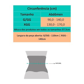 Características: - Confeccionada em material de alta qualidade; - Confortável revestimento interno forro em lycra ; - Ajuste conforme a sua necessidade. - G/GG circunferência abdominal entre 90 e 140cm - 62% poliéster, 23% poliamida, 8% nylon e 7% elastano