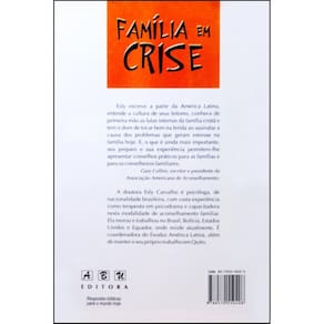 Familia em crise, esly carvalho - abu editora Esly regina escreve a partir da américa latina e entende a cultura de seus leitores, conhece as lutas internas da família cristã e tem o dom de tocar bem na ferida ao assinalar a causa dos problemas que geram na família hoje. E, o que é ainda mais importante, seu preparo e sua experiência permitem-lhe apresentar conselhos práticos para as famílias e para os conselheiros familiares. gary collins, escritor e presidente da associação americana de aconselhamento ========= Editora: abu editora 2002 Idioma: portugues Isbn: 8570550405 Ean: 9788570550408 Paginas: 91 Marca: Não Informado Ean: 7891947307672