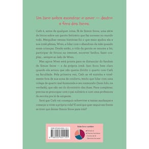 Da mesma autora de Eleanor & Park, uma história emocionante sobre amor em suas diversas formas e o poder da literatura em momentos difíceis, agora em uma nova edição. Cath é fã de Simon Snow, uma série de livros que faz sucesso no mundo todo sobre um garoto feiticeiro. Mergulhar nessas histórias foi a única maneira que ela encontrou de lidar, junto com sua irmã gêmea, Wren, com a partida da mãe quando eram crianças. Desde então, a vida da garota se resume a ler, participar de fóruns sobre Simon Snow na internet, escrever fanfics, fazer cosplay dos personagens… Sempre ao lado da irmã. Mas agora Wren parece pronta para se distanciar do fandom de Simon Snow — e da própria Cath. Afinal, ela deixou bem claro que é hora de cada uma trilhar seu próprio caminho quando avisou que não queria dividir o mesmo quarto na faculdade. Pela primeira vez, Cath se vê sozinha — e totalmente fora de sua zona de conforto —, e com uma colega de quarto mal-humorada que tem um namorado (bem fofo) que não sai do dormitório das duas. Para completar, ela também precisa se preocupar com o pai solitário e com sua professora de escrita literária, que abomina fanfics. Será que ela vai conseguir sobreviver a tantas mudanças e começar a viver a própria vida? E será que seguir em frente significa deixar Simon Snow para trás? * Best-seller do New York Times.* * Escolhido como um dos melhores livros juvenis pelo New York Times Book Review (2013).*