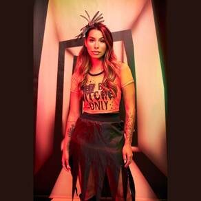 Seja a bruxa mais estilosa da festa! Esse conjunto com cropped estampado e saia assimétrica traz um visual moderno e divertido para arrasar no Halloween.