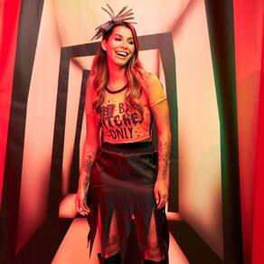 Seja a bruxa mais estilosa da festa! Esse conjunto com cropped estampado e saia assimétrica traz um visual moderno e divertido para arrasar no Halloween.
