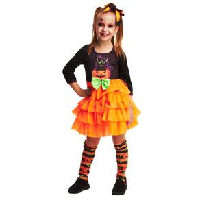 A saia da fantasia é composta por camadas na cor laranja, trazendo a energia vibrante do Halloween para o look da sua pequena bruxinha. O vestido vem com um laço delicado na cintura, que complementa perfeitamente o visual encantador com um toque de elegância e fofura!