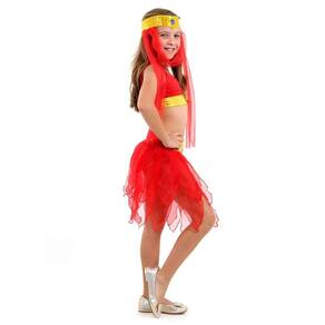 Uma bela fantasia, composta por top, saia, e véu vermelho com detalhes dourados metalizados com muito brilho, para deixar a fantasia mais bonita e completa!