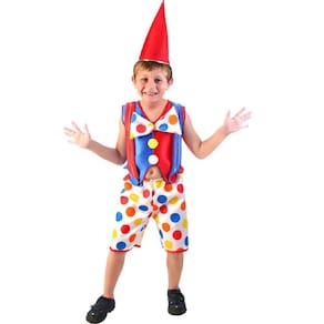 Complete o look festivo com um chapéu cônico vermelho, adicionando um toque charmoso e característico de palhaço.