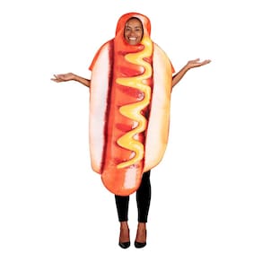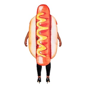 - O TRAJE INCLUI: túnica com estampa de cachorro-quente com orifício para a cabeça. Tamanho único para a maioria dos adultos.