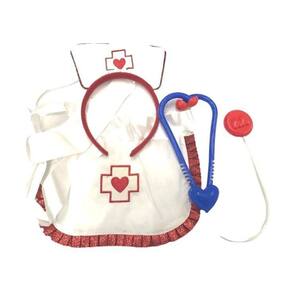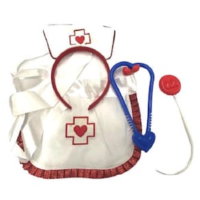 Fantasia De Enfermeira Kit Completo Estetoscópio de plástico. Arco aveludado e a parte de cima de pano. Serve para qualquer tipo de tamanho . Cor: branco e vermelho Material : tecido Contém: 1 avental 1 estetoscópio 1 arco Tamanho do avental:23,5x18,5cm Ean: 6015637976998