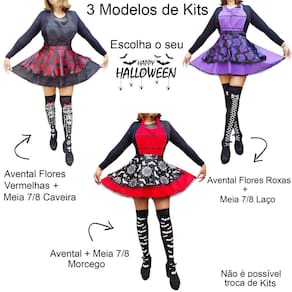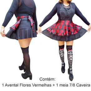 São três modelos de Kits: Avental com Rosas Vermelhas, Avental com Rosas Roxas e Avental com Morcegos. Todos os aventais acompanham meia 7/8 combinando. Escolha o seu preferido no campo variação de modelos.