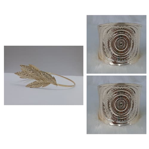 São 3 peças um conjunto de 1 Coroa Grega e 2 Braceletes para compor sua fantasia com material de qualidade, acabamento puro, durável, leve e ecológico.