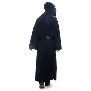 Túnica Elegante e Misteriosa: A túnica comprida preta é a base perfeita para o visual de feiticeiro. A gola em formato V, alongada e com detalhes prateados, acrescenta um toque de sofisticação ao traje.