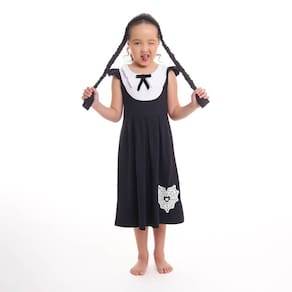 Fantasia Infantil da Menina Desgosto é em 100% algodão e trata-se de um vestido de manga curta com trancinhas para colocar no cabelo.
