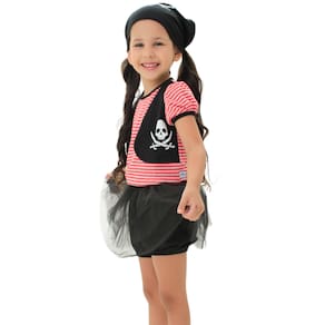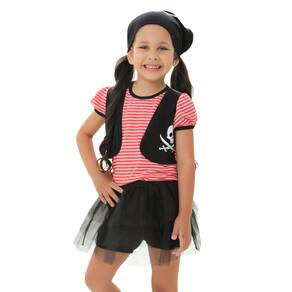 O pirata menina é a versão feminina do pirata, para meninas corajosas e aventureiras. Um conjunto de shorts balonê, camisetinha de mangas curtas com serigrafia e bandana com serigrafia. Para facilitar a colocação, a gola é em ribana. A malha é 100% algodão, tão confortável que as crianças não precisam tirá-la nem para dormir. Para completar a brincadeira, tem um tapa olho em feltro como acessório.