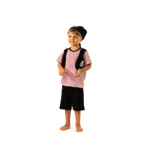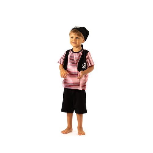 O pirata foi feita para meninos corajosos e aventureiros. Um conjunto de shorts, camiseta de mangas curtas com serigrafia e bandana com serigrafia. A gola em ribana facilita a colocação. A malha é 100% algodão, tão confortável que as crianças podem usá-la o dia todo, até para dormir. Para completar a brincadeira, vem com um tapa-olho em feltro como acessório. Marca: FÁBRICA DE SONHOS