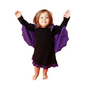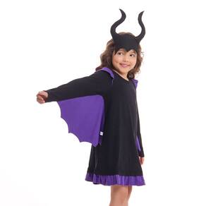 A fantasia infantil de Vilã em algodão se trata de um vestido infantil preto com mangas longas tipo morcego e detalhes em roxo. Confeccionado em material macio e aconchegante, esse vestido pode ser utilizado também como pijama, sendo ideal para a criança usar tanto na hora de brincar como na hora de dormir. Para completar a brincadeira, a peça acompanha uma tiara em feltro.