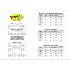 P: 3 anos (Tórax 65 cm | Cintura 52 cm | Quadril 69 cm | Ombro a Ombro 31 cm) M: 4 anos (Tórax 71 cm | Cintura 56 cm | Quadril 76 cm | Ombro a Ombro 33 cm) G: 5 e 6 anos (Tórax 77 cm | Cintura 60 cm | Quadril 84 cm | Ombro a Ombro 35 cm) GG: 7 e 8 anos (Tórax 83 cm | Cintura 64 cm | Quadril 96 cm | Ombro a Ombro 37 cm)