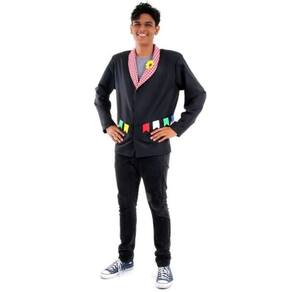 Fantasia Paletó Adulto Noivo Caipira: Paletó preto elegante para festas juninas, caipiras e temáticas. Confortável, com detalhes como penduricalhos coloridos e lenço xadrez floral. Versátil para combinar com diferentes peças e criar um visual único para dançar quadrilha e aproveitar o arraial com estilo e tradição.