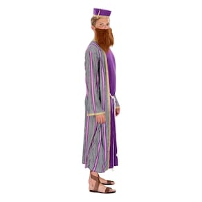 - Vestido chique masculino: basta adicionar ouro, incenso ou mirra à nossa fantasia roxa de Homem Sábio, perfeita para qualquer presépio!