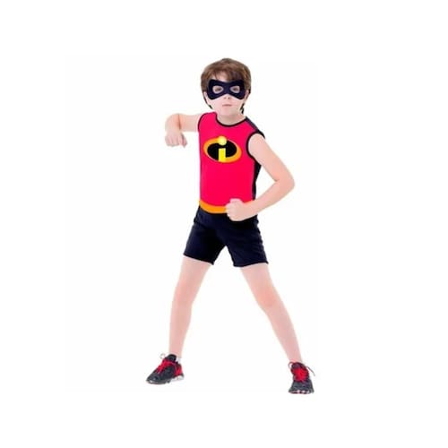 Embalagem contém macacão curto sem mangas com símbolo dos incríveis estampado no busto e máscara em eva com elástico. Confira essa excelente opção para o verão!