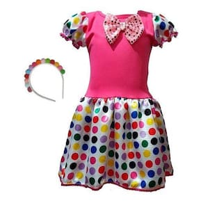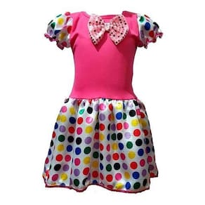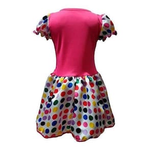 Vestido confeccionado em malha helanca rosa e cetim com estampa poá colorido.
