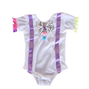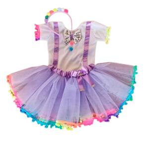 Fantasia confeccionada em ótima qualidade com o collant branco e saia de tule com aplicação em fitas.