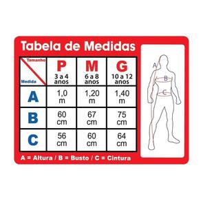 P - 3 a 4 anos ou c/ altura da criança, até 99cm M - 5 a 8 anos ou c/ altura da criança, entre 100 a 119cm G - 9 a 12 anos ou c/ altura da criança, entre 120 a 140cm