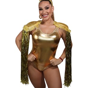 Especificações Técnicas Contém: 1 Body Metalizado, 1 Par de Ombreiras e 1 Tiara Cartola. NÃO ACOMPANHA DEMAIS ACESSÓRIOS. Composição de tecido: 100% poliéster Material do body: CirrêMaterial das ombreiras: Fitas MetalizadasMaterial da tiara: Eva, algodão, poliéster e polipropileno